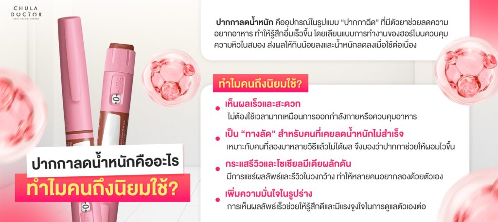 • ปากกาลดน้ำหนัก = ควบคุมความหิวชั่วคราว มีโอกาสดื้อยา และน้ำหนักกลับมาเพิ่มได้