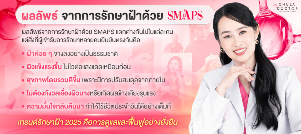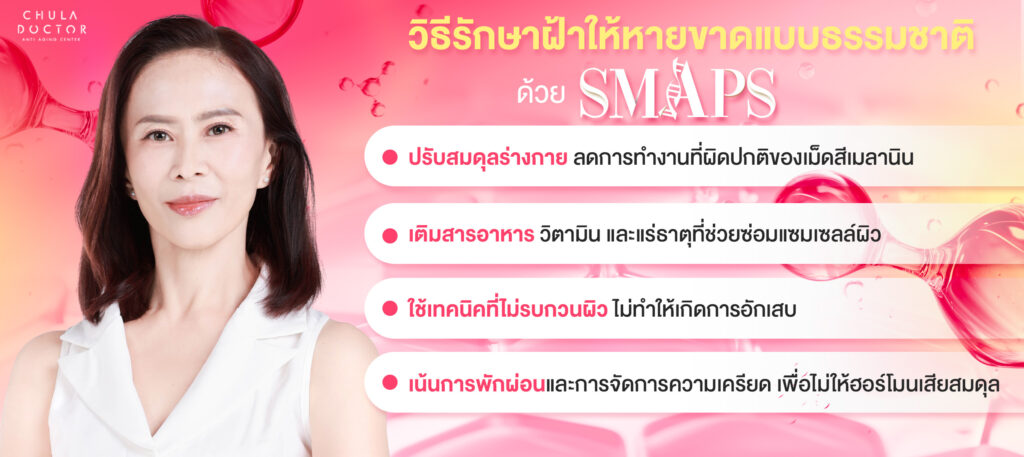 หนึ่งในวิธีรักษาฝ้าที่ถูกพูดถึงอย่างมากในปี 2025 ก็คือ SMAPS ซึ่งเป็นนวัตกรรมที่ CHULADOCTOR Wellness พัฒนาขึ้น โดยมีแนวคิดว่า “ฝ้าไม่ใช่แค่เรื่องของผิว แต่เป็นสัญญาณของความไม่สมดุลภายในร่างกาย”