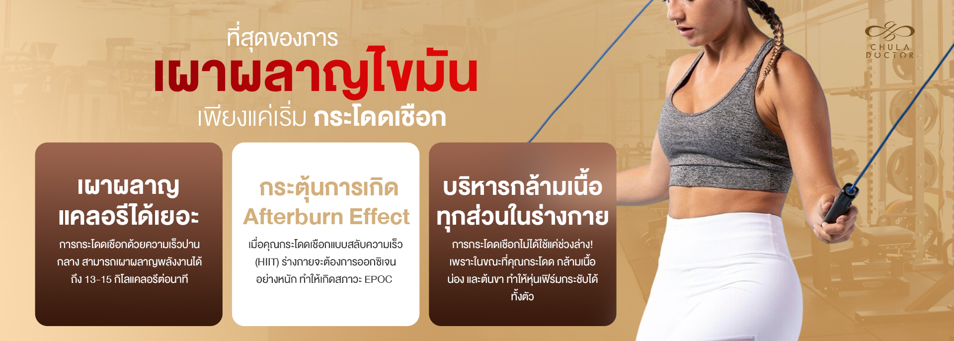 เมื่อคุณกระโดดเชือกแบบสลับความเร็ว (HIIT) ร่างกายจะต้องการออกซิเจนอย่างหนัก ทำให้เกิดสภาวะ EPOC (Excess Post-exercise Oxygen Consumption) ซึ่งหมายความว่า แม้คุณจะอาบน้ำเข้านอนไปแล้ว ร่างกายก็ยังคงดึงไขมันสะสมออกมาเผาผลาญอย่างต่อเนื่องไปอีก 12-24 ชั่วโมง