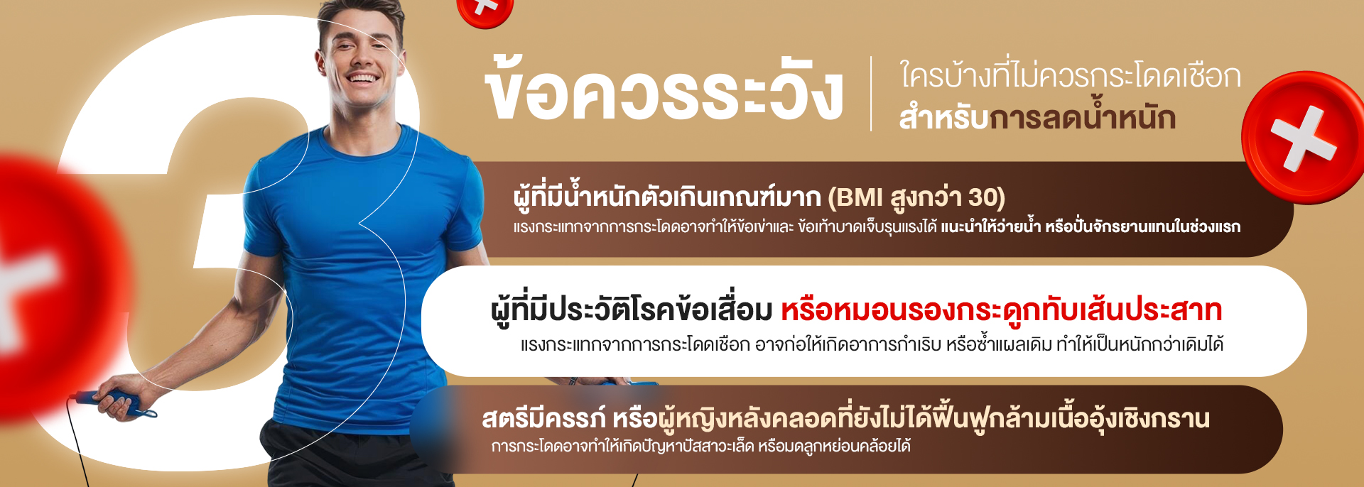 - ผู้ที่มีน้ำหนักตัวเกินเกณฑ์มาก (BMI สูงกว่า 30): แรงกระแทกจากการกระโดดอาจทำให้ข้อเข่าและข้อเท้าบาดเจ็บรุนแรงได้ แนะนำให้ใช้วิธีลดน้ำหนักด้วยการว่ายน้ำ หรือปั่นจักรยานแทนในช่วงแรก เมื่อน้ำหนักลดลงแล้วจึงค่อยเริ่มกระโดดเชือก