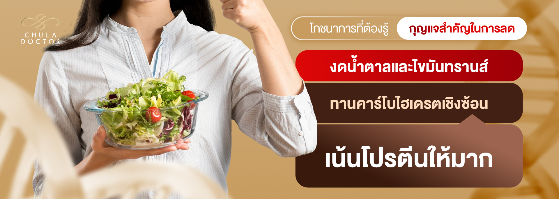 สำหรับผู้ที่ต้องการแนวทางฟื้นฟูระบบเผาผลาญอย่างปลอดภัยและมีประสิทธิภาพมากขึ้น แนะนำโปรแกรมลดน้ำหนัก LISA ของ CHULADOCTOR WELLNESS CENTER ที่ออกแบบโดยแพทย์ โดยใช้โปรแกรม LISA ลดน้ำหนักที่ออกแบบเฉพาะบุคคล ช่วยปรับสมดุลฮอร์โมน ฟื้นระบบเผาผลาญ โดยไม่เน้นการอดอาหาร เพื่อให้คุณกลับมามีระบบเผาผลาญดีอย่างยั่งยืน