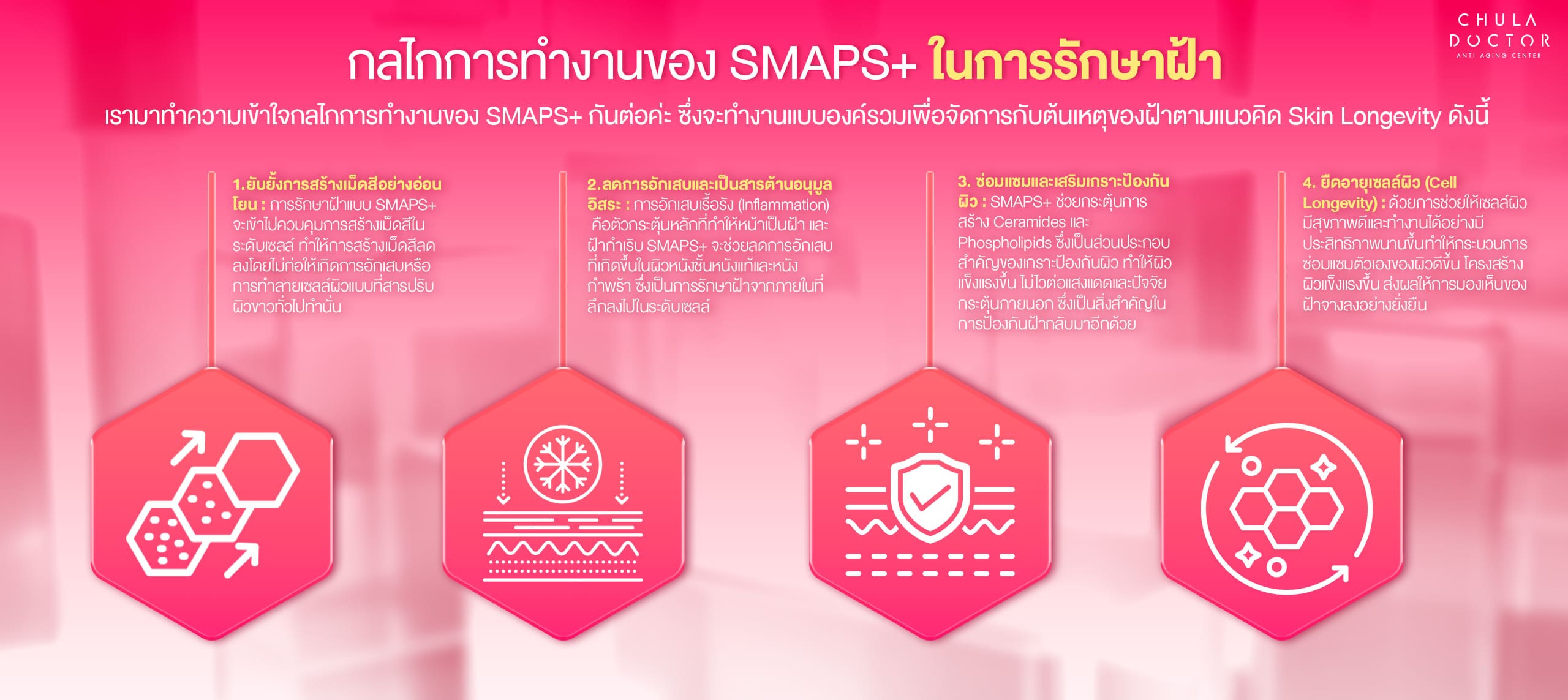 เรามาทำความเข้าใจกลไกการทำงานของ SMAPS+ กันต่อค่ะ ซึ่งจะทำงานแบบองค์รวมเพื่อจัดการกับต้นเหตุของฝ้าตามแนวคิด Skin Longevity ดังนี้
