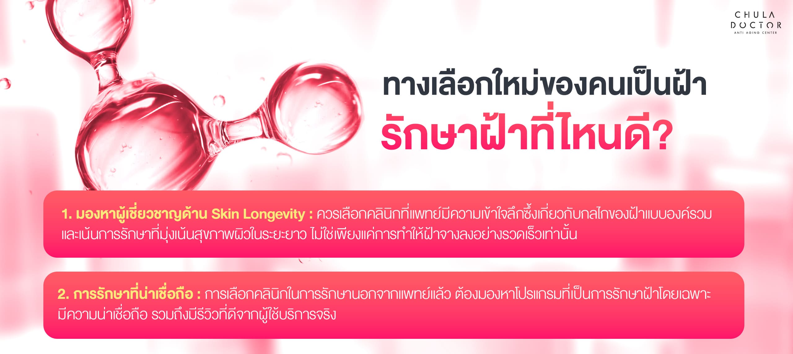 1. มองหาผู้เชี่ยวชาญด้าน Skin Longevity : ควรเลือกคลินิกที่แพทย์มีความเข้าใจลึกซึ้งเกี่ยวกับกลไกของฝ้าแบบองค์รวม และเน้นการรักษาที่มุ่งเน้นสุขภาพผิวในระยะยาว ไม่ใช่เพียงแค่การทำให้ฝ้าจางลงอย่างรวดเร็วเท่านั้น