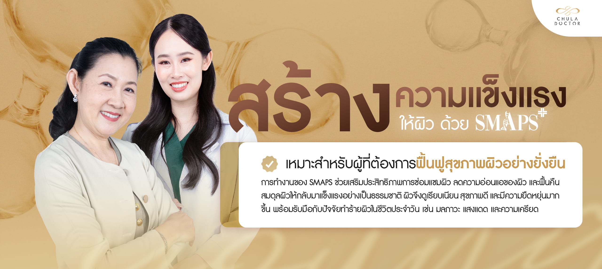 SMAPS คือโปรแกรมฟื้นฟูผิวหน้าที่คิดค้นและดูแลโดยทีมแพทย์ผู้เชี่ยวชาญจากคลินิกจุฬาดอกเตอร์ โดยเป็นเทคนิคการรักษาที่มุ่งเน้นการฟื้นฟูผิวในระดับลึกถึง ระดับเซลล์ผิว ช่วยซ่อมแซมเซลล์ที่เสื่อมสภาพและกระตุ้นกระบวนการฟื้นฟูผิวตามธรรมชาติ ส่งผลให้โครงสร้างผิวแข็งแรงขึ้นจากภายในสู่ภายนอก