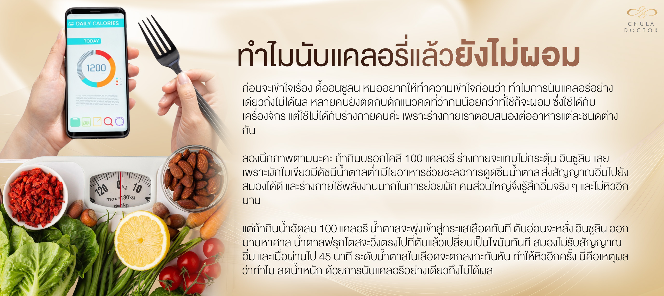 ก่อนจะเข้าใจเรื่อง ดื้ออินซูลิน หมออยากให้ทำความเข้าใจก่อนว่า ทำไมการนับแคลอรีอย่างเดียวถึงไม่ได้ผล หลายคนยังติดกับดักแนวคิดที่ว่ากินน้อยกว่าที่ใช้ก็จะผอม ซึ่งใช้ได้กับเครื่องจักร แต่ใช้ไม่ได้กับร่างกายคนค่ะ เพราะร่างกายเราตอบสนองต่ออาหารแต่ละชนิดต่างกัน