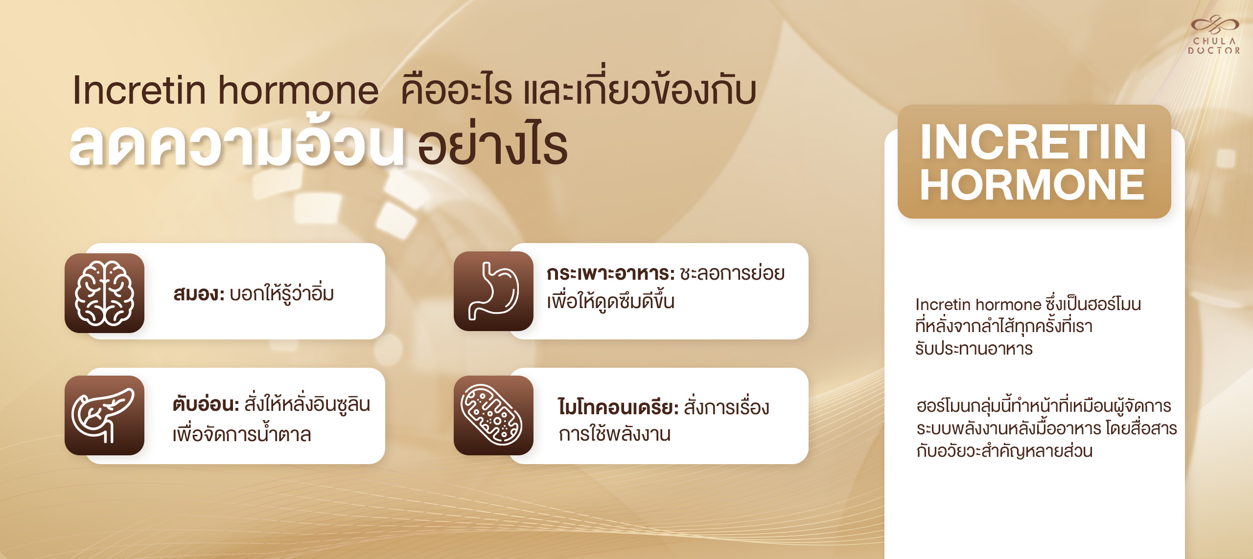 Incretin หลักที่เราพูดถึงกันบ่อยคือ GLP-1 และ GIP ซึ่งจะส่งสัญญาณให้ร่างกายหลั่งอินซูลินอย่างเหมาะสม ลดการหลั่งกลูคากอน ชะลอการล้างกระเพาะ และทำให้สมองรับรู้ความอิ่ม ทั้งหมดนี้เกิดขึ้นเฉพาะ “ช่วงที่มีอาหารจริง”