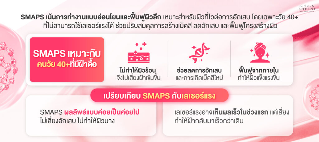 จุดเด่นของ SMAPS คือ ไม่ทำให้ผิวร้อน จึงไม่เสี่ยงฝ้าเข้มขึ้น ช่วยลดการอักเสบและการเกิดเม็ดสีใหม่ได้ดี เหมาะมากสำหรับผู้ที่มีประวัติยิงเลเซอร์แรงแล้วฝ้ากลับเร็ว ผู้ที่ผิวบาง และผู้ที่มีฮอร์โมนเปลี่ยนแปลง การฟื้นฟูจากภายในและภายนอกพร้อมกัน ทำให้ผิวแข็งแรงขึ้น ลดการเกิดฝ้าซ้ำในระยะยาวได้ชัดเจนกว่าเทคนิคเดิม